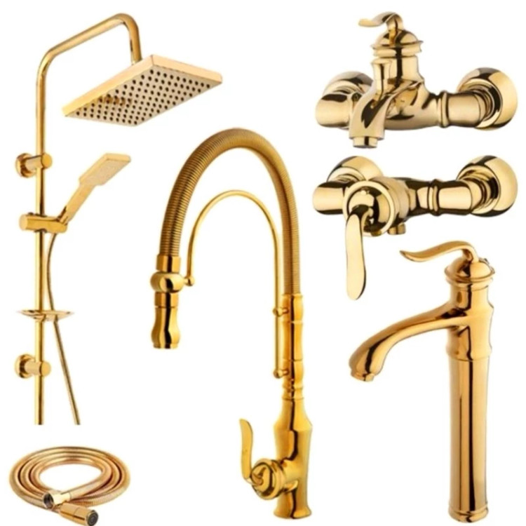ست 6 تایی شیرآلات هلن طلایی با شیر ظرفشویی فنری و شیر روشویی پایه بلند و علم دوش دوکاره و شیلنگ توالت