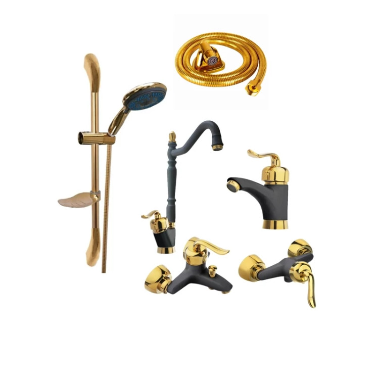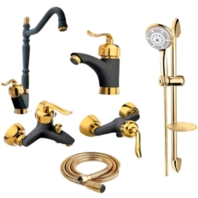 ست 6 تایی شیرآلات قاجاری مشکی طلایی با علم دوش تک کاره و شیلنگ توالت