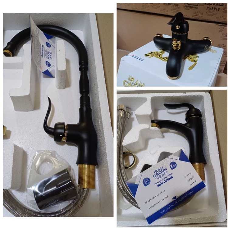 ست کامل شیرآلات سزار مشکی طلایی برند محصول ایران گروه میباشد با ۷ سال گارانتی معتبر و استاندارد ملی ایران همراه با لوازم و اتصالات نصب آبکاری درجه یک و تنه برنجی شامل : ۱عدد شیر روشویی - ۱عدد شیر آفتابه- ۱عدد شیر دوش - ۱عدد شیر ظرفشویی ارسال به سراسر کشور