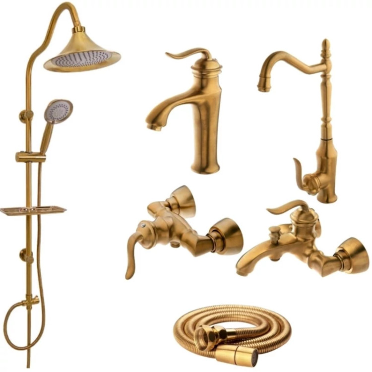 ست 6 تایی شیرآلات هلن طلایی مات با علم دوش دوکاره شیپوری و شیلنگ توالت
