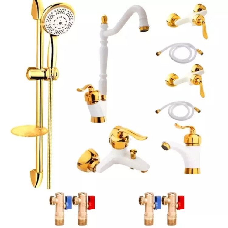 ست ۱۲ تایی شیرآلات قاجاری سفید طلایی شامل : ۲ عدد شیر آفتابه - ۲عدد شیلنگ آفتابه - ۱ عدد شیر ظرفشویی- ۱عدد شیر روشویی-۱عدد شیر دوش - ۴ عدد شیر صافی دار سایز ۳.۸ برنجی - ۱ عدد علم دوش تک کاره طلایی برند محصول ایران گروه میباشد با ۷ سال گارانتی معتبر و استاندارد ملی ایران تنه برنجی و آبکاری درجه یک و مقاوم و کاتریج ۴۰ پر فشار همراه با لوازم و اتصالات نصب ارسال به سراسر کشور در کمترین زمان
