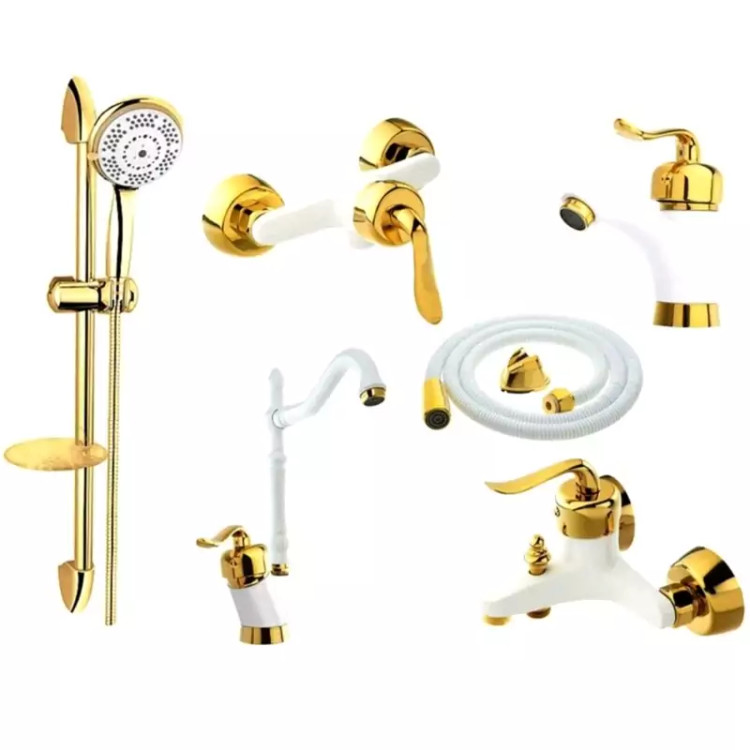 ست ۶ تایی شیرآلات قاجاری سفید طلایی با علم دوش تک کاره طلایی و شیلنگ توالت برند محصول ایران گروه میباشد با ۷ سال گارانتی معتبر و استاندارد ملی ایران تنه برنجی و آبکاری درجه یک و مقاوم و کاتریج ۴۰ پرفشار همراه با لوازم و اتصالات نصب شامل : ۱عدد شیر روشویی - 1عدد شیر ظرفشویی - ۱عدد شیر دوش - ۱عدد شیر آفتابه - ۱عدد علم دوش تک کاره طلایی - ۱عدد شیلنگ توالت سفید طلایی ارسال به سراسر کشور در کمترین زمان ممکن