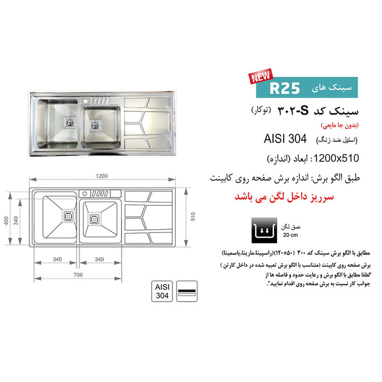 سینک اخوان توکار 302s دارای دو لگن است.این سینک از جنس استیل ضد زنگ به قطر 1 میلیمتر ساخته شده طول آن 120 سانت و عرض آن 50 سانت است. سینکهای اخوان دارای 10 سال ضمانت شرکت اخوان از تاریخ فاکتور فروش می باشند .