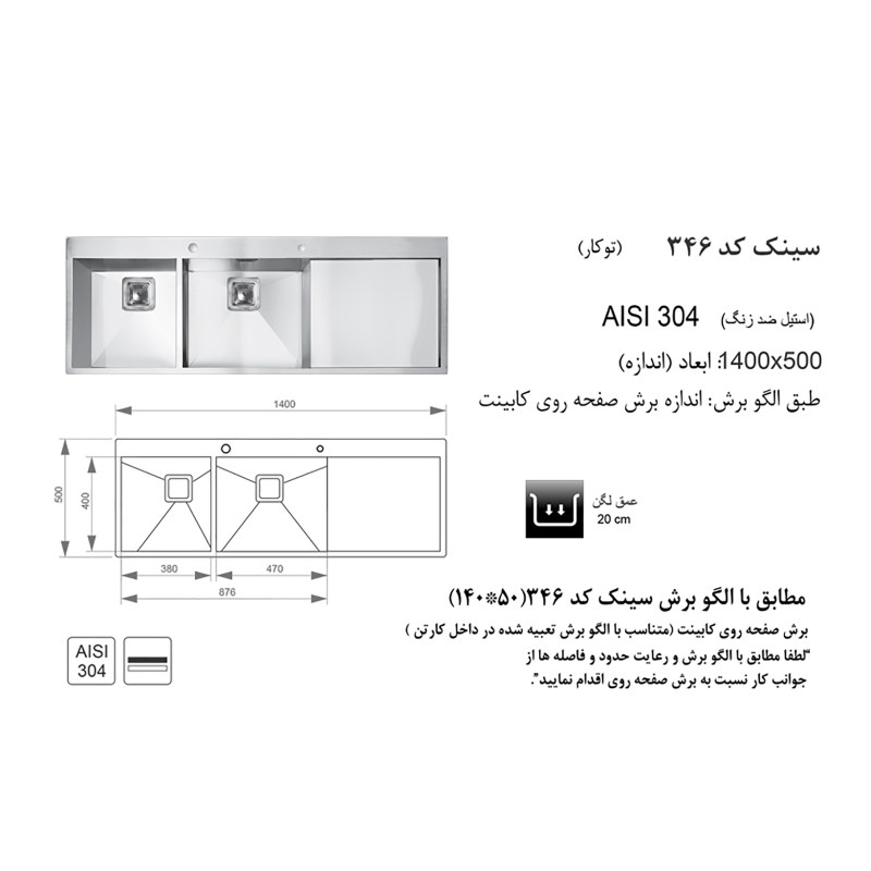 نحوه نصبتوکارجنس سینکاستیلتعداد لگندوعمق لگن200طرح سینکسادهنوع سیفونمعمولیسایر توضیحاتابعاد دقیق سینک 140 در 50 سانتی متر می باشد.ابعاد سینک500 × 1250