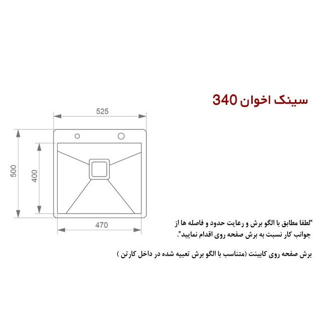 ابعاد خارجی محل نصب : 50 در 52.5 سانتی متر نوع زیراب استفاده شده : مربع با تخلیه سریع ضخامت ورق : استیل با ضخامت بالا، یک میلیمتری
