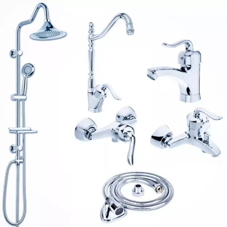 ست 6 تیکه شیرآلات قاجاری کروم به همراه شیلنگ توالت و علم دوش دوکاره شیپوری
