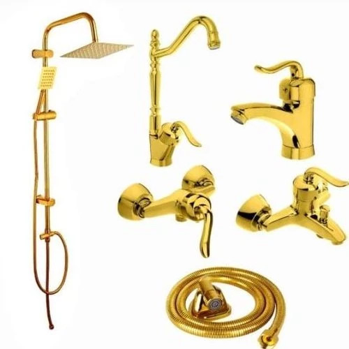 ست کامل شیرآلات اهرمی قاجاری طلایی با دوش دوکاره و شیلنگ توالت