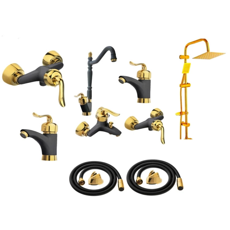 ست 9 تایی شیرآلات قاجاری مشکی طلایی با علم دوش دوکاره طلایی و شیلنگ توالت مشکی طلایی برند محصول ایران گروه میباشد با 7 سال گارانتی معتبر و استاندارد ملی ایران تنه برنجی و آبکاری درجه یک و کاتریج 40 همراه با لوازم و اتصالات نصب شامل: 1عدد شیر دوش- 1عدد شیر ظرفشویی- 2 عدد شیر روشویی - 2عدد شیر آفتابه - 2عدد شیلنگ توالت مشکی طلایی - 1 عدد علم دوش دوکاره طلایی ارسال به سراسر کشور