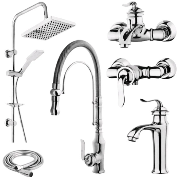 ست 6 تایی شیرآلات هلن کروم با شیر ظرفشویی فنری و علم دوش دوکاره و شیلنگ توالت