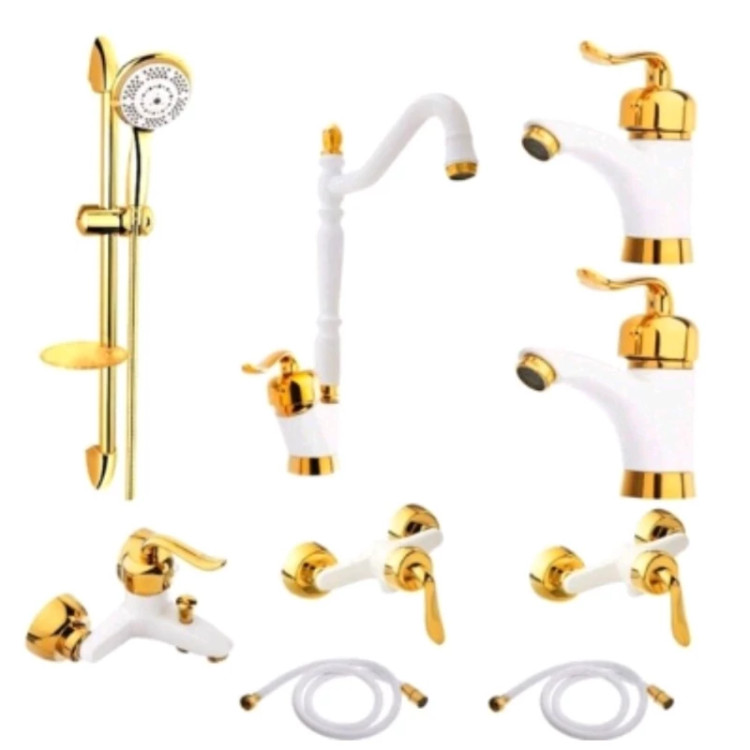 ست ۹ تایی شیرآلات قاجاری سفید طلایی با علم دوش تک کاره طلایی برند محصول ایران گروه با ۷ سال گارانتی معتبر و استاندارد ملی ایران با تنه برنجی و آبکاری درجه یک و کاتریج ۴۰ همراه با لوازم و اتصالات نصب شامل : ۲عدد شیر روشویی-۱عدد شیر ظرفشویی-۲عدد شیر آفتابه- ۱عدد شیر دوش -۱عدد علم دوش تک کاره طلایی - ۲ عدد شیلنگ توالت سفید طلایی ارسال به سراسر کشور در کمترین زمان ممکن کل ارتفاع شیر ظرفشویی ۳۰ سانت و قسمت آبریز شیر ۲۰ سانت میباشد