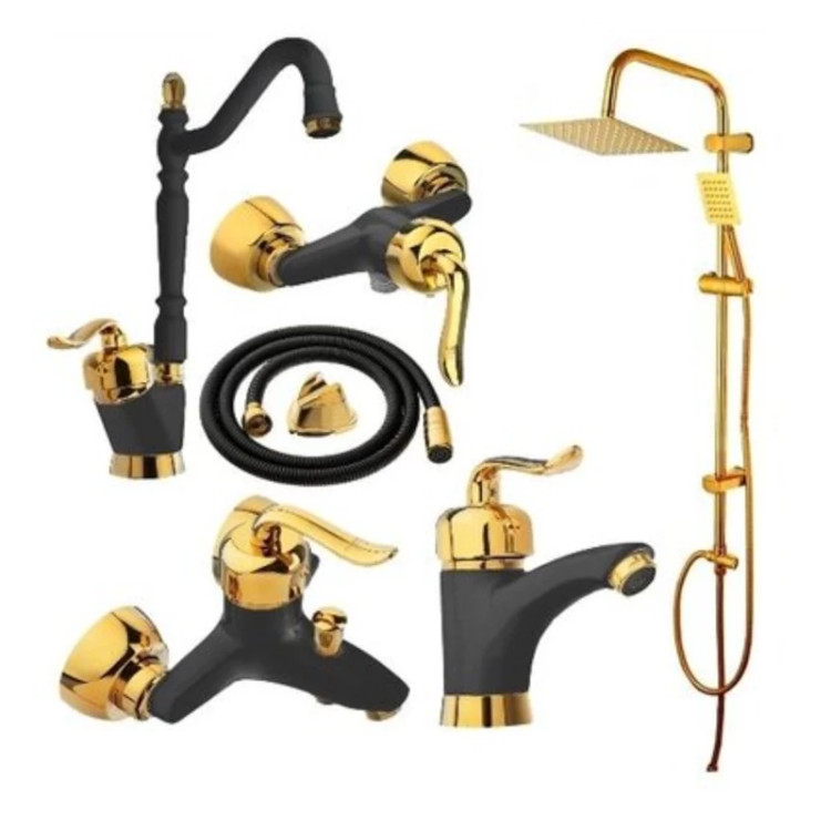ست 6 تایی شیرآلات قاجاری مشکی طلایی با علم دوش دوکاره و شیلنگ توالت
