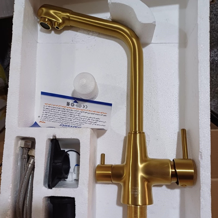 شیر ظرفشویی دو منظوره آوین طلایی مات برند محصول ایران گروه میباشد با ۷ سال گارانتی معتبر و استاندارد ملی ایران تنه برنجی سنگین و آبکاری درجه یک دارای دو خروجی آب شهری و تصفیه آب همراه با لوازم و اتصالات نصب ارسال به سراسر کشور