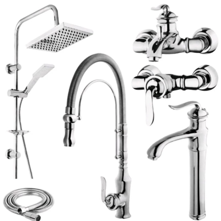 ست 6 تایی شیرآلات هلن کروم با شیر ظرفشویی فنری و شیر روشویی پایه بلند و علم دوش دوکاره و شیلنگ توالت
