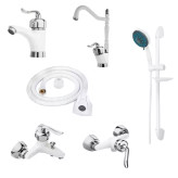 ست کامل شیرآلات قاجاری سفید کروم برند ایران گروه با ۷ سال گارانتی و استاندارد شامل چهار عدد شیر : روشویی-ظرفشویی-آفتابه-دوش کاتریج ۴۰ به همراه علم دوش تک کاره و شیلنگ توالت